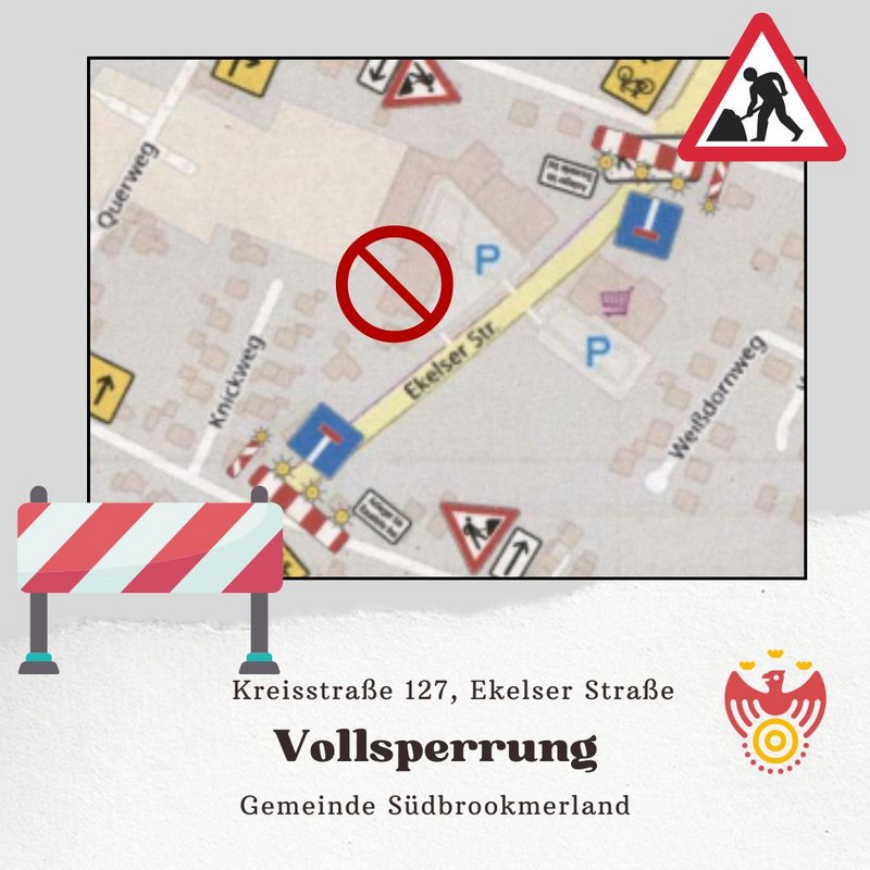 Die K 127 (Ekelser Straße) in Moordorf ist vom 22. September bis 17. Oktober 2025 zwischen dem Kreisverkehr Ritzweg und dem Mittelweg voll gesperrt.