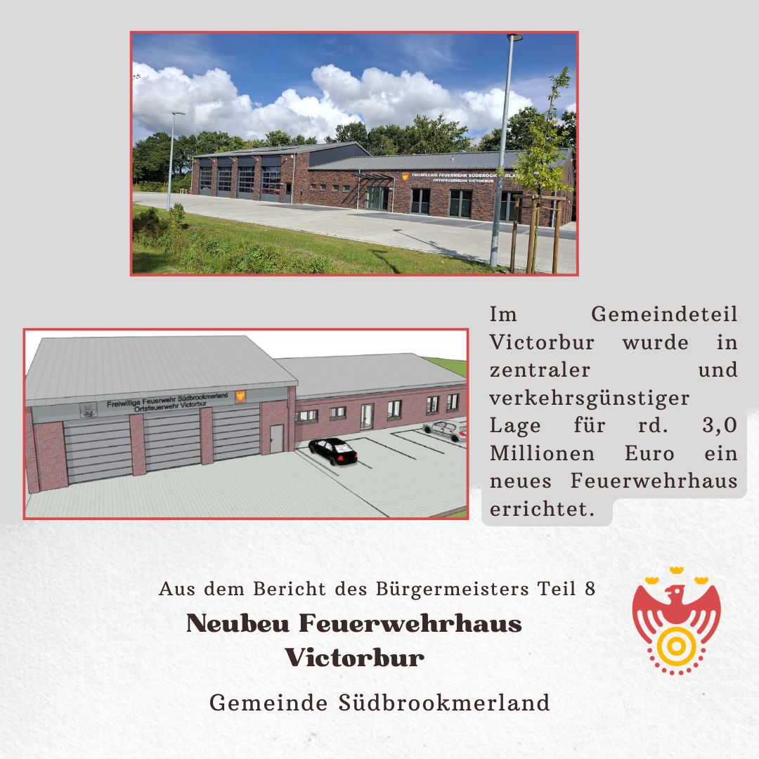 Im Gemeindeteil Victorbur wurde in zentraler und verkehrsgünstiger Lage für rd. 3,0 Millionen Euro ein neues Feuerwehrhaus errichtet. Den Kameradinnen und Kameraden der Ortswehr Victorbur kann in diesem den Bestimmungen der Feuerwehrunfallkasse entsprechendem Gebäude künftig ihren Dienst ausüben. Das Feuerwehrhaus verfügt über 4 Einstellboxen. Damit kann der im Feuerwehrbedarfsplan beschriebene künftige Fahrzeugbestand untergebracht werden. Für die notwendige Anpassung der Feuerwehrhäuser Münkeboe/Moorhusen sowie Oldeborg wurden erforderliche Grundstücksflächen angekauft. Derzeit laufen für das Feuerwehrhaus Münkeboe/ Moorhusen Detailplanungen für einen Neubau.