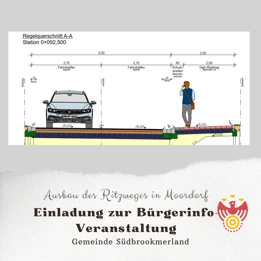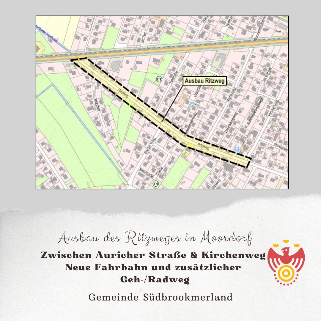 Die Gemeinde Südbrookmerland plant den Ausbau des Ritzweges auf einer Länge von rd. 680m. Die Maßnahme beinhaltet den Umbau der Fahrbahn sowie den Neubau eines Rad- und Gehweges.