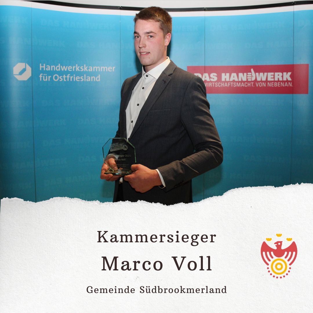 Bei der Kammersiegerehrung vor rund 150 Gästen, wurde Marco von Kammerpräsident Albert Lienemann für seine außergewöhnlichen Ausbildungsleistungen ausgezeichnet. Mit großem Applaus nahm er seinen Pokal und die Urkunde als „Kammersieger 2025“ entgegen.