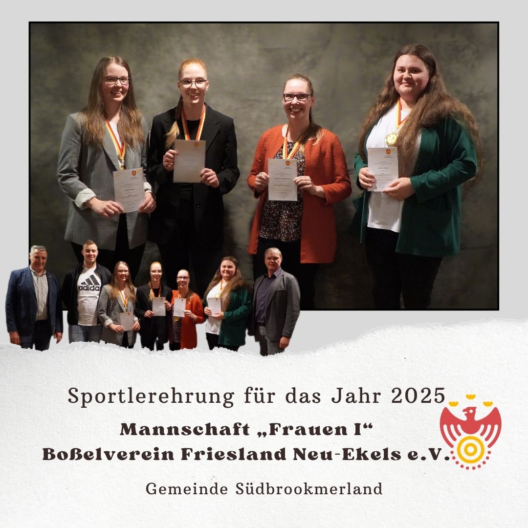 Am Freitag, dem 06. Februar 2026, wurde die Mannschaft „Frauen I“ des Boßelvereins Friesland Neu-Ekels e.V. im Rahmen der Sportlerehrung für das Jahr 2025 für die sportlichen Leistungen geehrt.