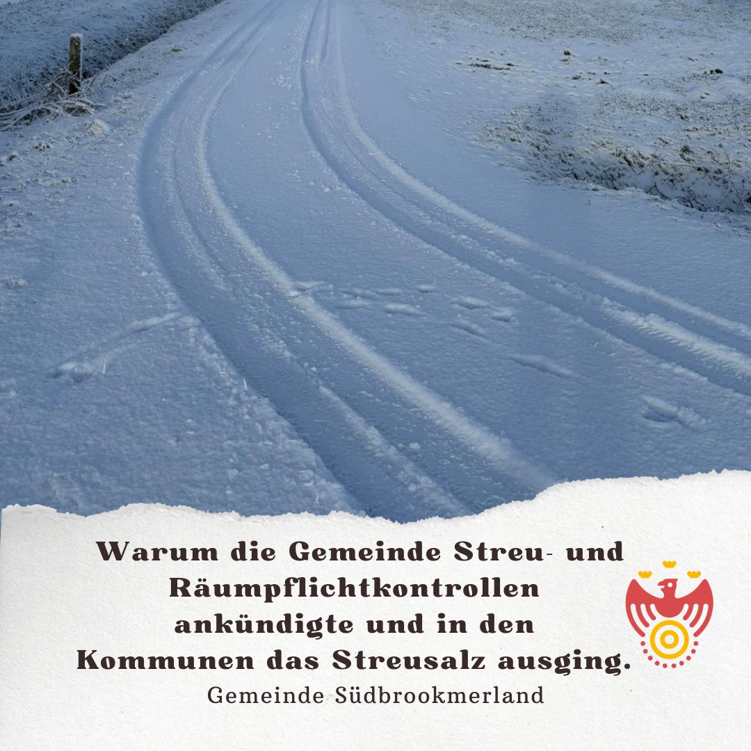 In einer Mitteilung wurde auf die Streu- und Räumpflicht der Bürger hingewiesen, während in der anderen informiert wurde, dass es in den hiesigen Kommunen zu Engpässen bei der Lieferung von Streusalz gekommen ist.