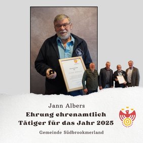Am Mittwoch, dem 04. Februar 2026, wurde Jann Albers im Rahmen der Ehrung von ehrenamtlich Tätigen für das Jahr 2025 für seine engagierte und verlässliche Arbeit für den Mühlenverein Wiegboldsbur geehrt. Bürgermeister Thomas Erdwiens sowie der Ausschussvorsitzende Berthold Lübben würdigten seinen jahrelangen Einsatz für das kulturelle Leben in der Gemeinde.