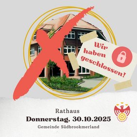 Das Rathaus der Gemeinde Südbrookmerland ist am 30. Oktober 2025 aufgrund einer betrieblichen Veranstaltung geschlossen.